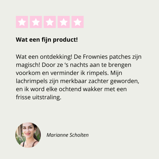 Veel mensen zijn erg tevreden over de Frownies Facial Patches! Veelgehoorde positieve opmerkingen zijn bijvoorbeeld dat de patches de huid gladder maken, de rimpels en lijntjes verminderen en de huid er over het algemeen jonger en frisser uit laten zien. Ook wordt vaak benadrukt dat de patches 100% natuurlijk zijn en dat ze comfortabel en niet irriterend zijn.